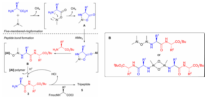 El equipo de H. Yamamoto propuso una estrategia de síntesis de péptidos en un solo paso basada en un mecanismo de anillo de cinco miembros. Este método aprovecha al máximo la multifuncionalidad del trimetilaluminio, que activa el grupo carboxilo y coordina el ataque nucleofílico del grupo amino, logrando una síntesis de péptidos eficiente y altamente estereoselectiva.