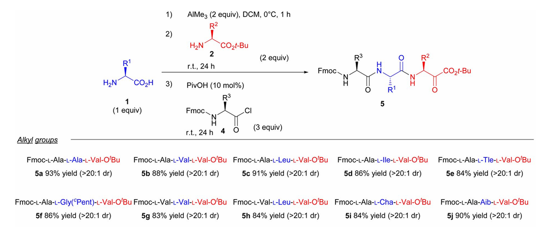 El equipo empleó la síntesis de tripéptidos como reacción modelo para explorar las condiciones de reacción. Finalmente, determinaron que el diclorometano era el disolvente adecuado y que los aminoácidos libres y el trimetilaluminio se premezclaban a baja temperatura (0 °C ) para activar el grupo carboxilo. Posteriormente, el tripéptido se sometió a una reacción de amidación con éster metílico de aminoácido a temperatura ambiente y a un tratamiento ácido con ácido pentílico para asegurar la liberación completa del grupo amino. Por último, el tripéptido se obtuvo mediante reacción con Fmoc para proteger el cloruro de aminoacilo.
